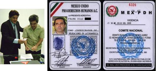 - En el año 2008, justamente por la época en que Julio Diana fue detenido, Frank Diaz publica en foros una fotografía alterada de una AC, donde simula ser el “representante de derechos humanos de toda Latinoamérica”, es evidente que es un photoshop, no está en el organigrama del lugar, y cuando me comuniqué con ellos no lo conocen. Simplemente es una credencia que daban por 20 pesos de cooperación. El día que detuvieron a Julio yo llevaba en la mano una impresión de la imagen,. y los teléfonos de contacto de la AC. La imagen está mas abajo